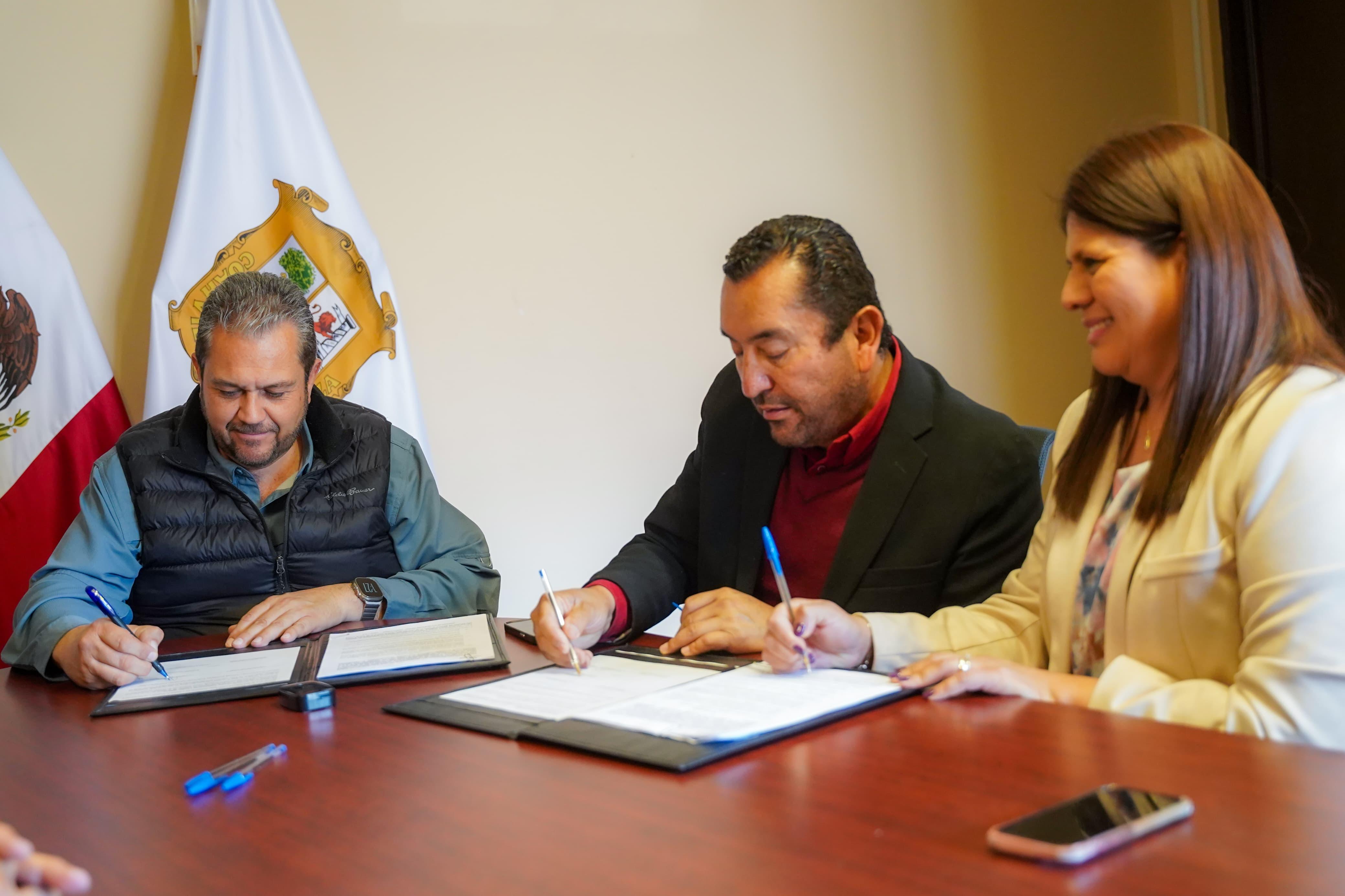Tomás Gutiérrez Merino, alcalde de la ciudad; Alejandro González Farías, secretario del ayuntamiento; junto con Cristina Victoria Palma, presidenta de la AECHAC en Coahuila, rubricaron el acuerdo.