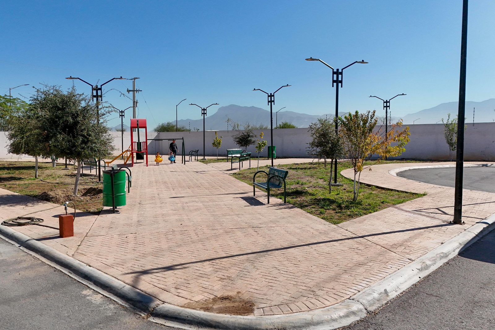 En Hacienda El Refugio, se trabaja en la instalación de juegos infantiles, luminarias, pintura de cordón cuneta, recuperación de bancas, colocación de botes de basura, plantación de árboles y mantenimiento general, con el objetivo de recuperar un punto de convivencia seguro para las familias.